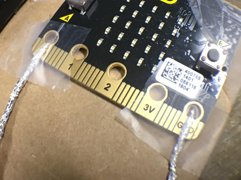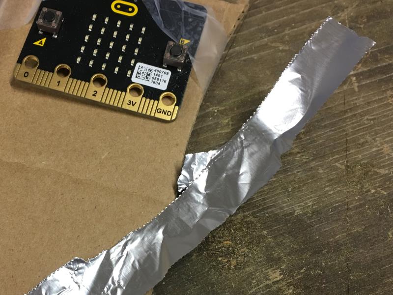 If you do not have crocodile clips at hand, you can use wires or even Aluminium foil to achieve the same result. We will show you how to connect the micro:bit to headphones using Aluminium foil and tape.