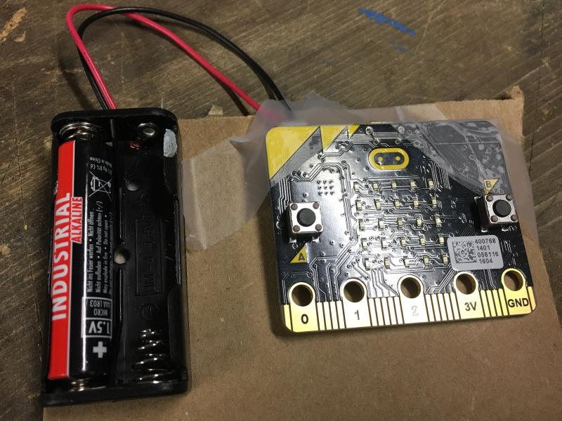 Tape the micro:bit and battery pack to the card board. Make sure to remove the batteries while you are building your circuit.