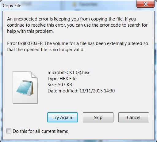 You can’t drag and drop more than one hex file at once onto your micro:bit. If you try to drag and drop a second hex file onto your micro:bit before the first file has finished downloading, then the second file may fail in different ways.