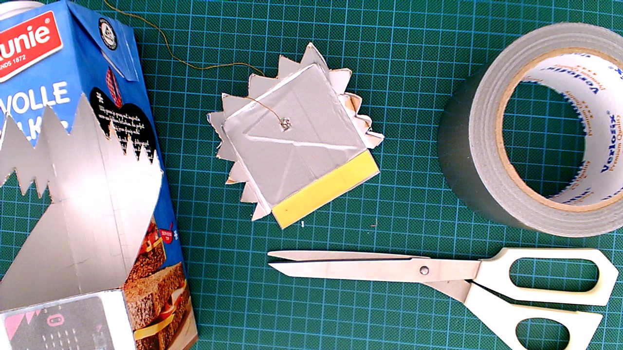 Cut the cardboard halfway and fold the corners. This forms the mouth of the Milky Monster.