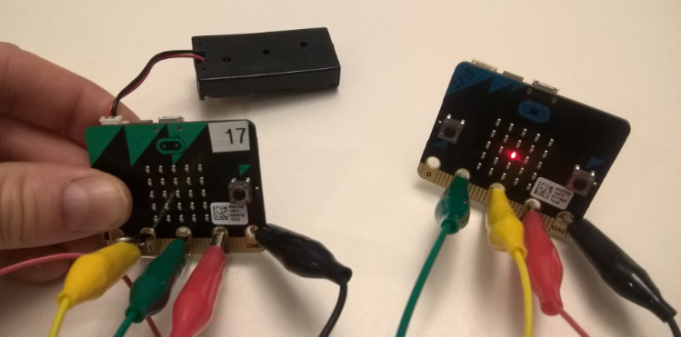 2 micro:bits, a battery holder, and 2 AAA batteries