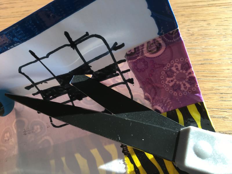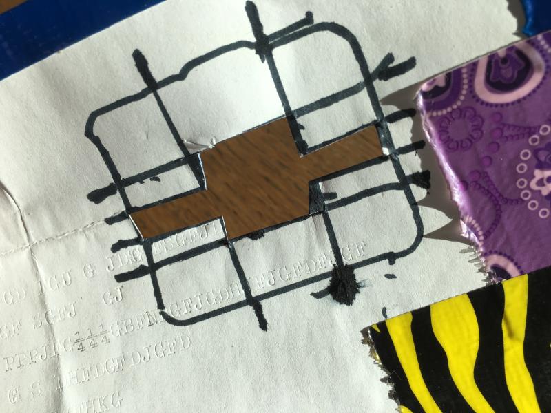 Fold the sheet over the center of the darken area and cut out a triangle large enough to squeeze a blade of the scissors.