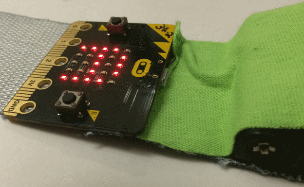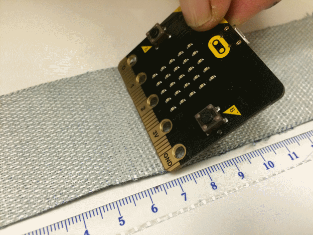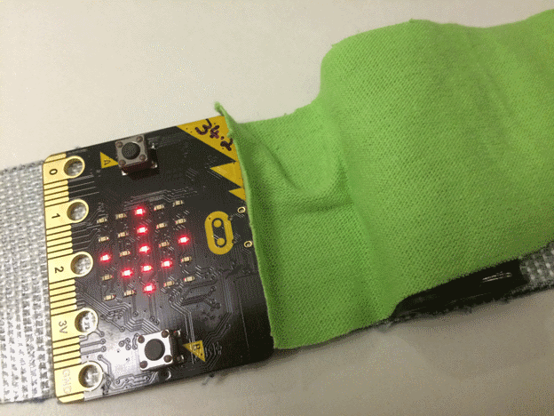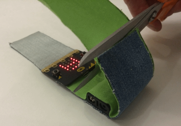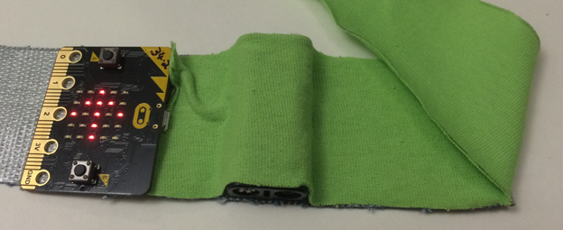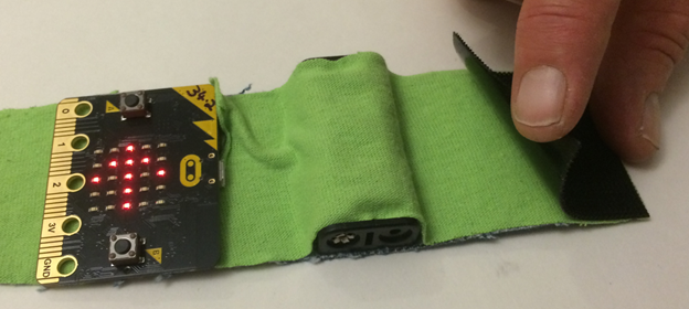 Use your fingers to push the T-shirt cloth under the micro:bit to give access to the micro-USB plug.