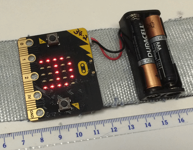 Stick the T-shirt rectangle from the top of the micro:bit, over the battery cables.