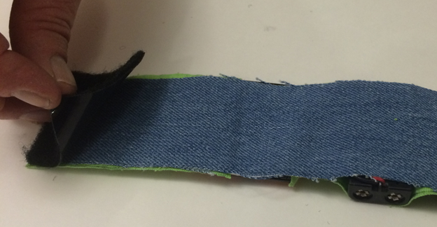 Stick the Velcro hooks on the right side of the battery holder on the T-shirt cloth.
