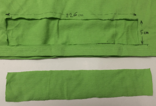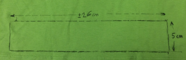 Using the ruler and pen, mark a rectangle of more or less 26cm x 5cm on the T-shirt. Don’t worry if you don’t get it quite right, we’ll tidy things up later on.